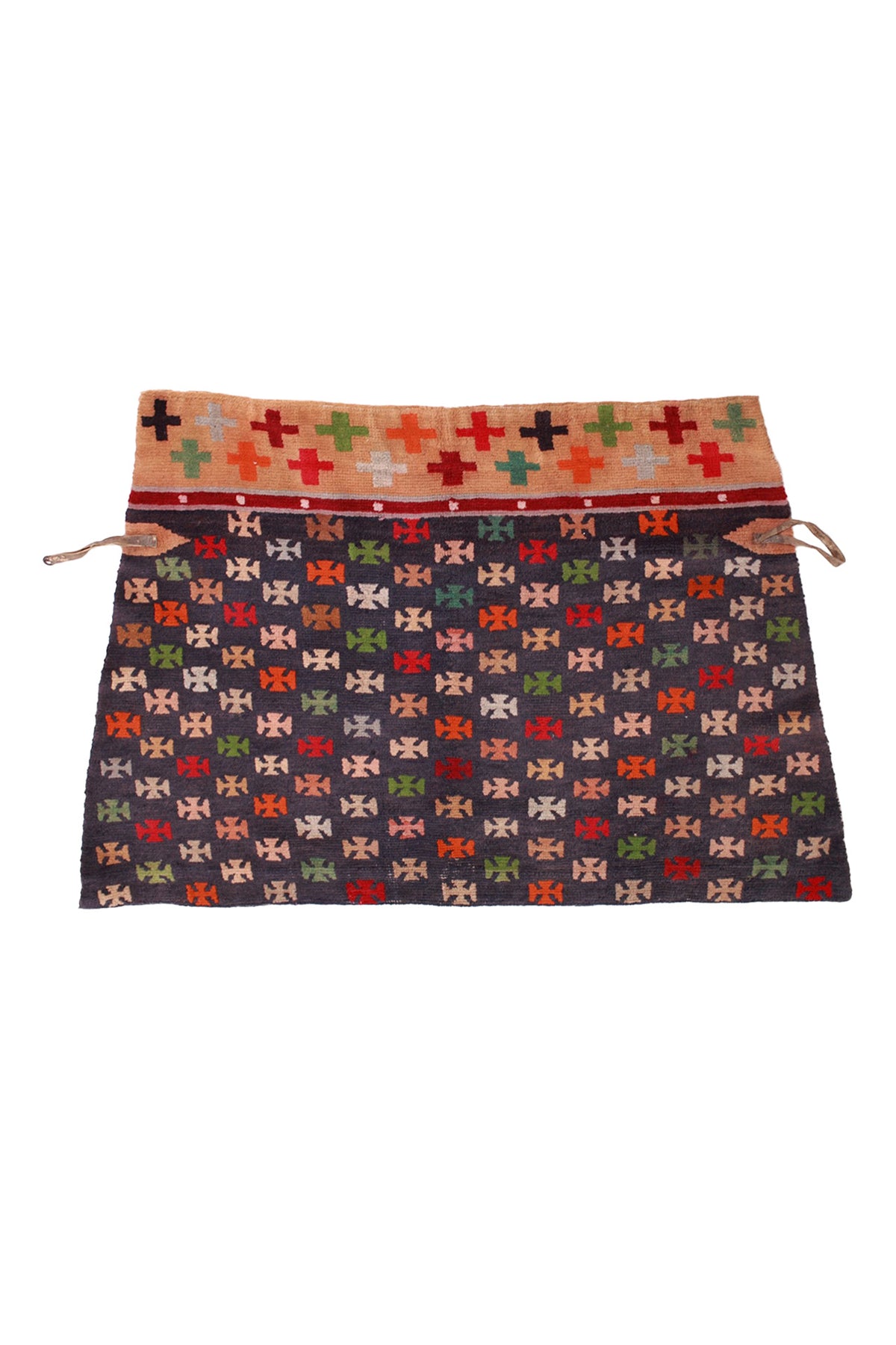 This hand-knotted Tibetan horse blanket, crafted from hand-spun wool around 1900, exemplifies the rich textile traditions of Tibet. The upper section features a deep cream-orange band adorned with two rows of multi-coloured crosses, known as tigma.