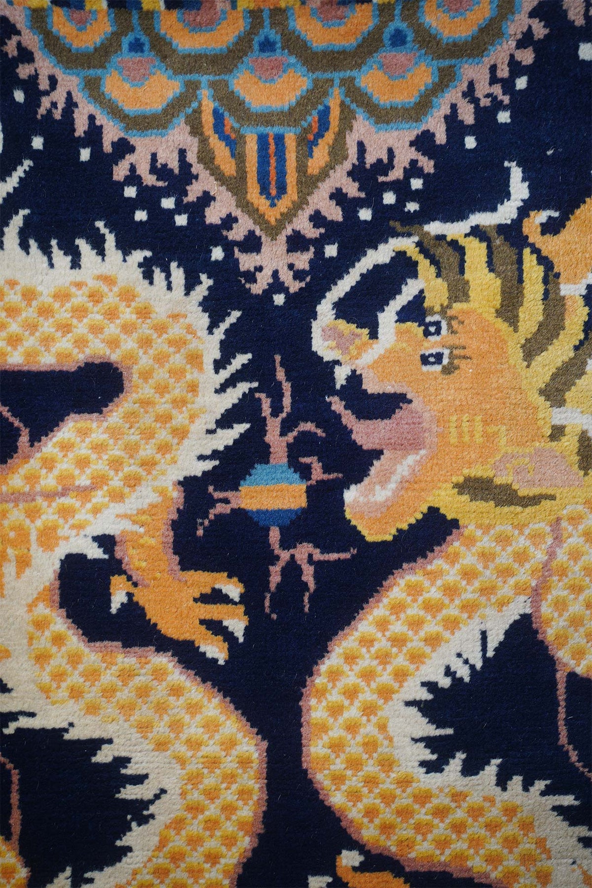 The deep indigo ground provides a dramatic nocturnal field, against which the dragons — rendered in luminous tones — emerge with an almost ethereal presence. This contrast heightens both the visual impact and the symbolic reading of the piece.