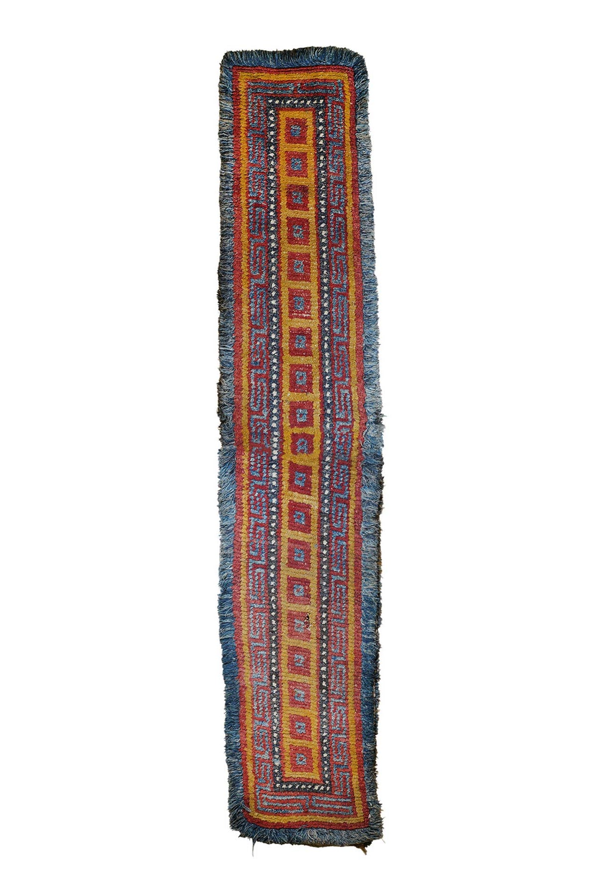 This antique Tibetan warp-faced monastery runner expresses a quiet balance between structure and fluidity. Its elongated composition is defined by a rhythmic sequence of geometric motifs, gently softened by the natural irregularities of handweaving.